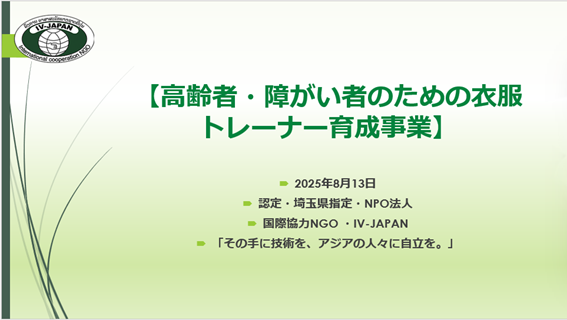 | 特定非営利活動法人国際協力NGO・IV-JAPAN | 高齢者・障がい者のための衣服づくりトレーナー育成事業 | ラオス人民民主共和国 | 500,000 |