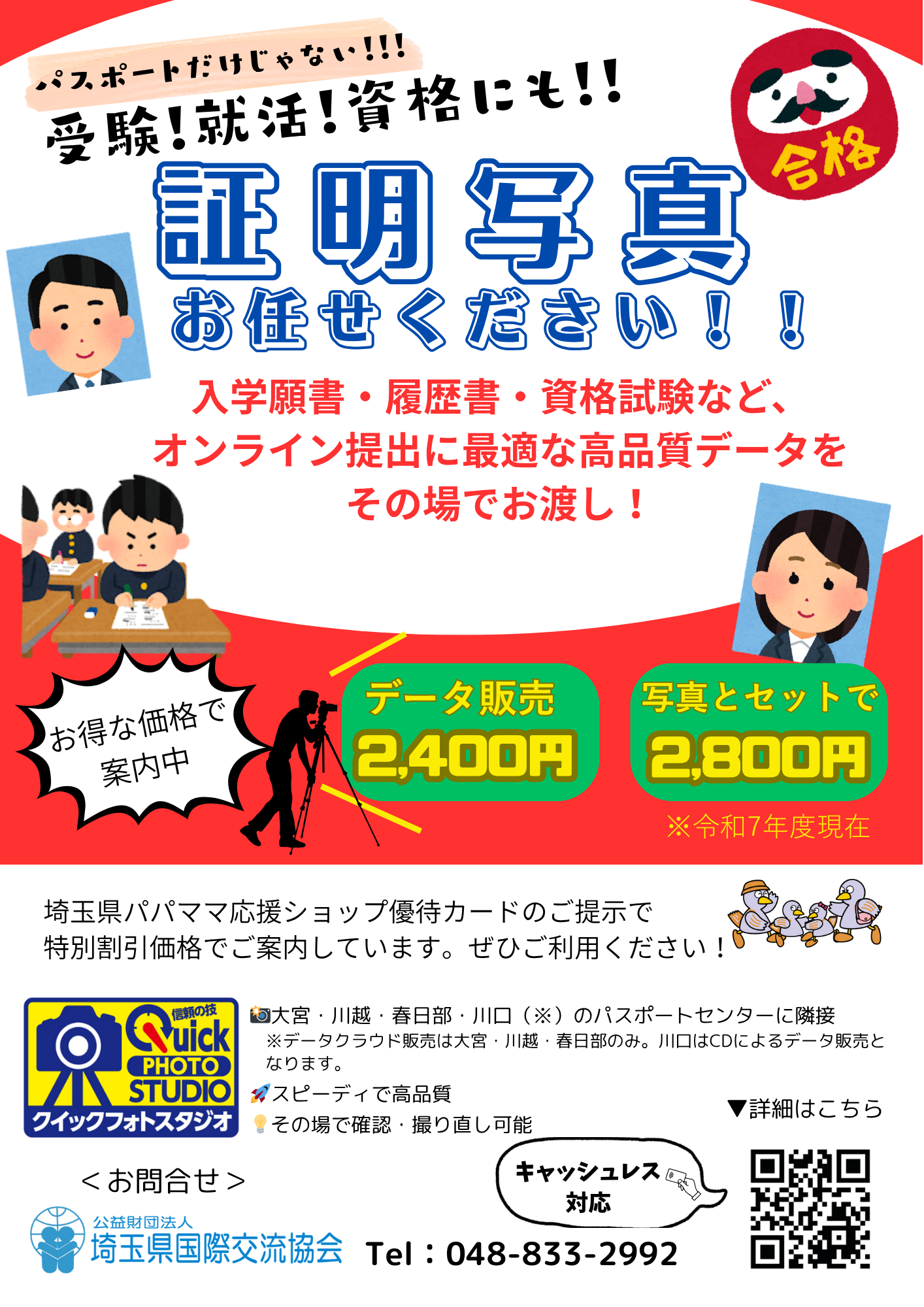 埼玉県国際交流協会では、県パスポートセンター(大宮、川越、春日部)と川口市パスポートセンターの計4か所に証明写真撮影コーナー「クイックフォトスタジオ」を併設して、専属のスタッフが写真撮影を行っています。