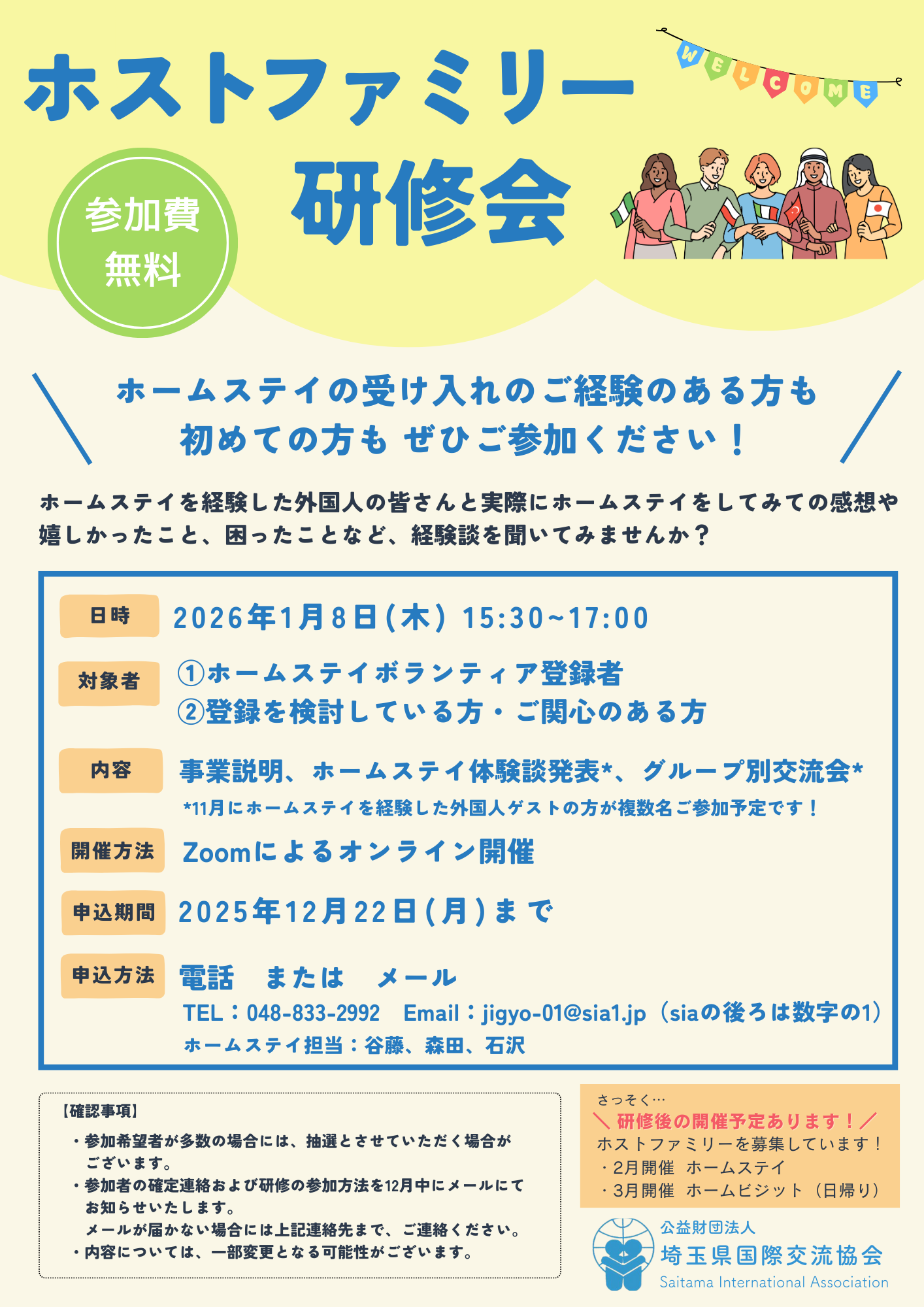 この度、ホームステイを経験したことのある外国人ゲストをお招きし、ホームステイの経験談を直接お聞きいただける研修会を開催いたします!